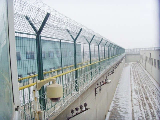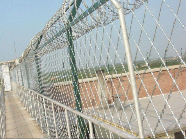 監(jiān)獄防護網(wǎng)主要是采用高強度的刀片刺網(wǎng)與普通防護網(wǎng)的結(jié)合,由V型支架立拄,加強型焊接片網(wǎng),安全防盜連接件和刀片刺網(wǎng)組成.刀片刺網(wǎng)是一種新型防護網(wǎng),由銳利尖角鍍鋅鋼板或不銹鋼薄板做刀片,鋼絲做芯線組合而成的防護器材。